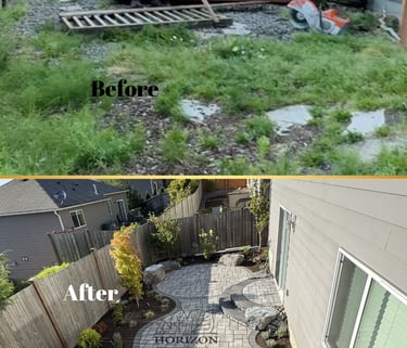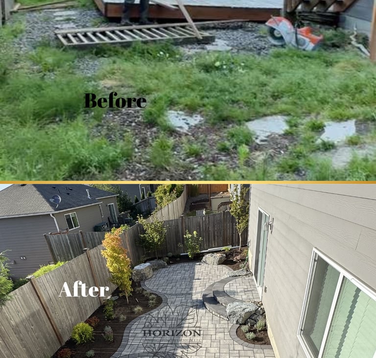 Originally an uneven and undefined yard, this space required grading adjustments and structural planning. We reconfigured the layout to introduce a curved paver patio, reinforced edging, and integrated planting zones that frame the space naturally. Natural stone elements were added to enhance dimension and create visual anchors throughout the design.